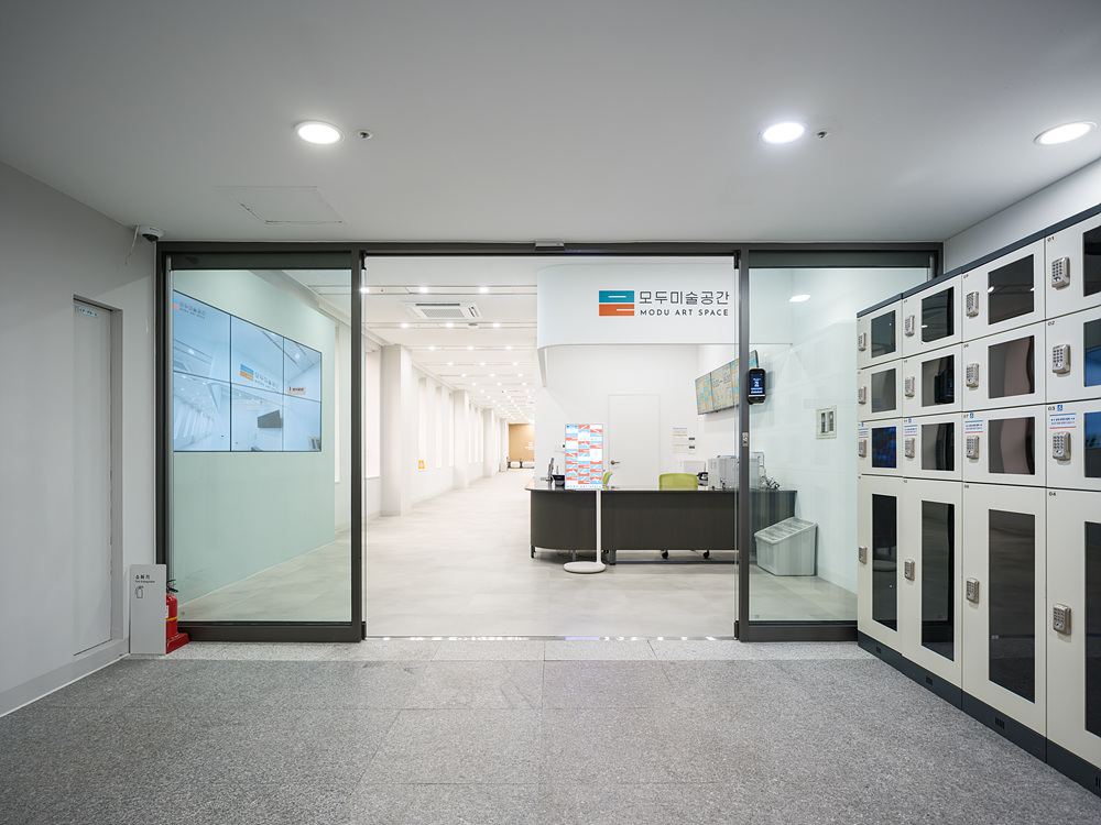 모두미술공간은 형태를 자유롭게 바꿀 수 있는 전시장으로 하나의 전시실로 사용하거나, 가벽을 통해 전시실1, 전시실2로 나누어 사용할 수 있습니다. 전시의 형태와 유형에 따라 다양한 예술 작품을 전시할 수 있는 활용도 높은 공간입니다.